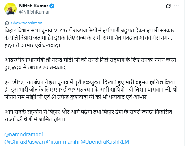 वहीं बिहार विधानसभा चुनाव में एनडीए की जीत के बाद मुख्यमंत्री नीतीश कुमार ने सोशल मीडिया पर प्रतिक्रिया दी है। इस जीत पर बिहार की जनता का धन्यवाद करते हुए उन्होंने लिखा कि ‘बिहार विधान सभा चुनाव-2025 में राज्यवासियों ने हमें भारी बहुमत देकर हमारी सरकार के प्रति विश्वास जताया है। इसके लिए राज्य के सभी सम्मानित मतदाताओं को मेरा नमन, हृदय से आभार एवं धन्यवाद।