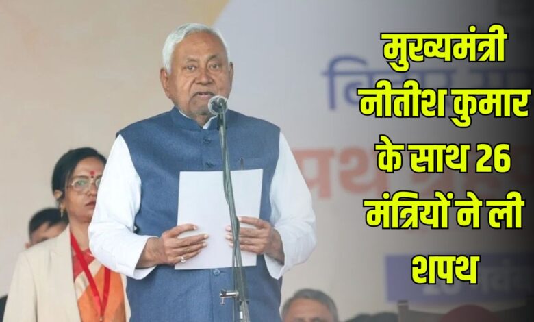 इस दौरान नीतीश कुमार ने मुख्यमंत्री पद की शपथ ली। मुख्यमंत्री के अलावा मंच पर 26 मंत्रियों ने भी बिहार कैबिनेट में राज्य मंत्री के तौर पर शपथ ली। जिनमें बीजेपी के 14, जदयू से 8, लोजपा(आर) से 2, हम और कुशवाहा की पार्टी से 1-1 को मंत्री बनाया गया है।