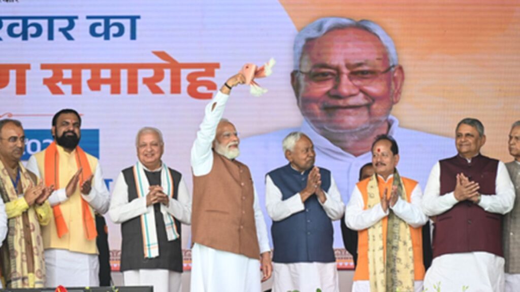 पटना के गांधी मैदान में आज भव्य शपथ ग्रहण समारोह आयोजित हुआ। जिसमें प्रधानमंत्री नरेंद्र मोदी, केंद्रीय गृह मंत्री अमित शाह, बीजेपी अध्यक्ष जेपी नड्डा के अलावा हरियाणा, असम, गुजरात, मेघालय, यूपी, नागालैंड, ओडिशा, दिल्ली, एमपी और राजस्थान के मुख्यमंत्री भी शामिल हुए।